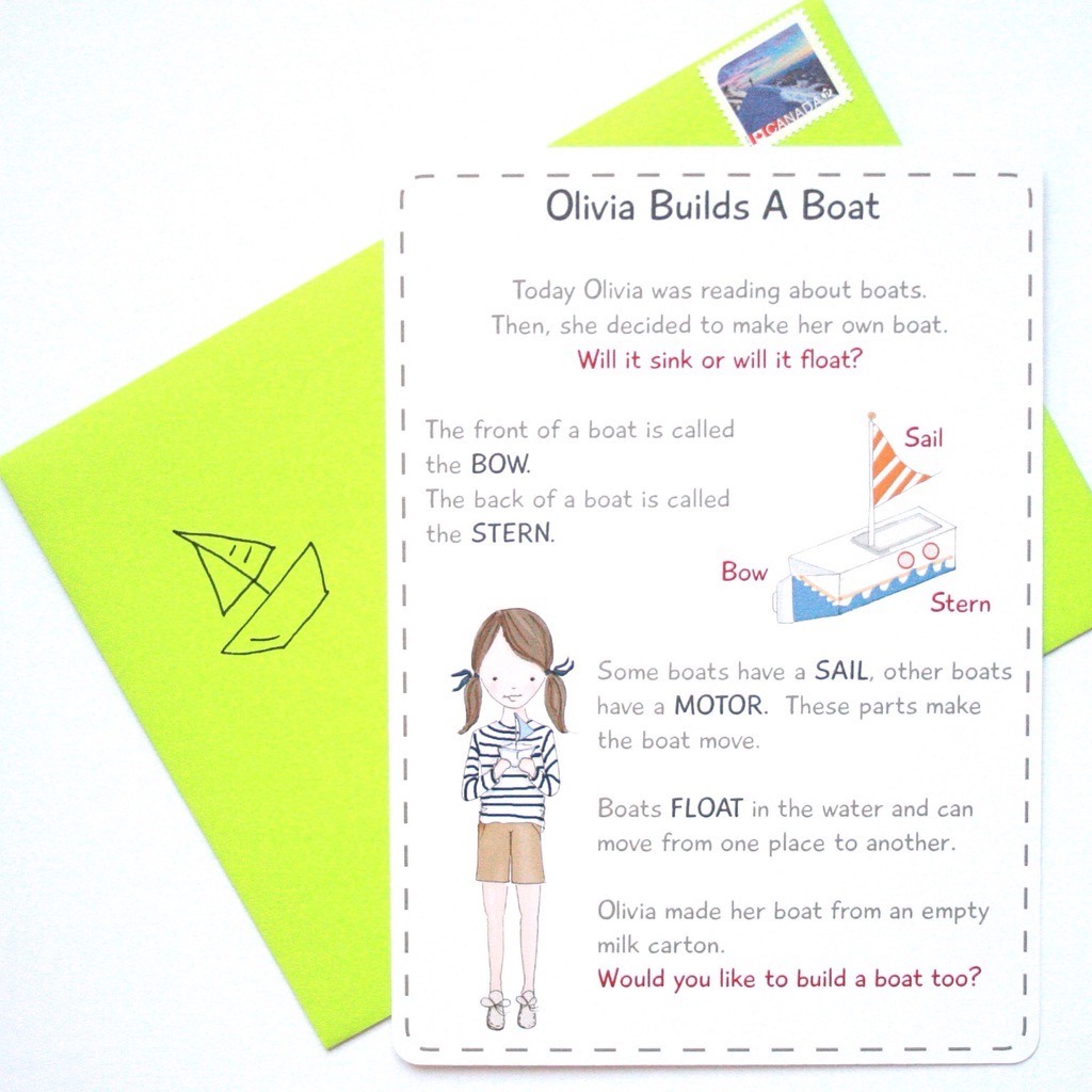 Petit Mail is a double-sided story postcard, mailed in a bright colorful envelope and addressed to your child each month, featuring the adventures of Oliver + Olivia.