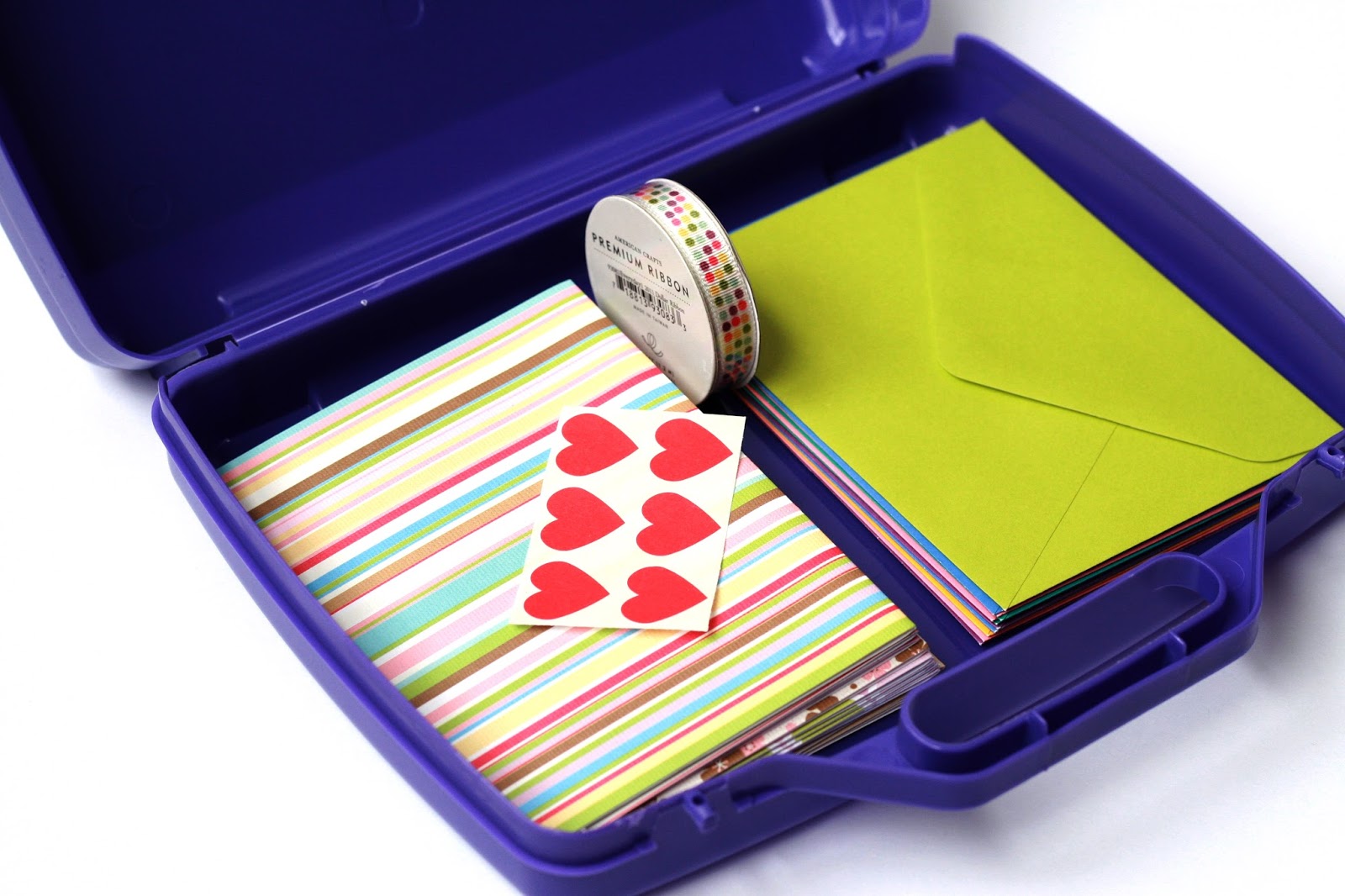I picked up this small purple plastic "suitcase" and created a custom label for the outside.  Inside, I gave her all of the tools she might need to write special notes - blank cards and envelopes, embellishments, stickers, and stamps.